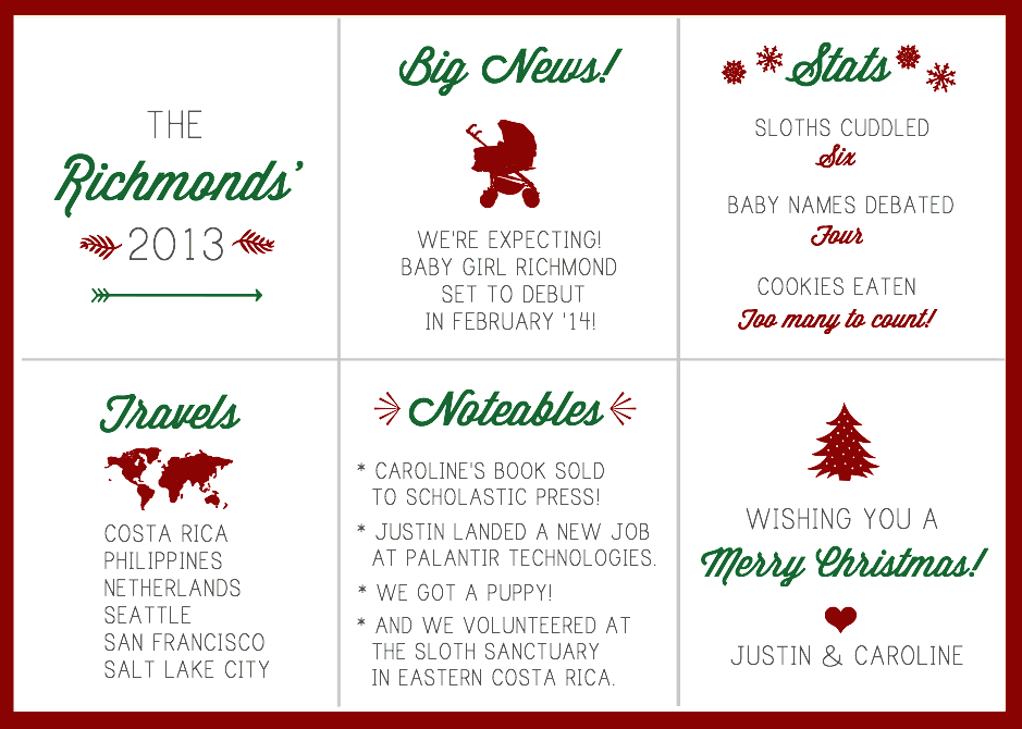 So here's a little graphic I made to recap the Richmonds' in 2013. I started off unlucky '13 with no expectations (because the last couple years have been tough on our little family) but Lady Luck must have pitied Justin and me because it has been quite the whirlwind year! I'm looking forward to 2014 with a lot of excitement and frazzled nerves. A baby! A book! And lots of cookies to consume!